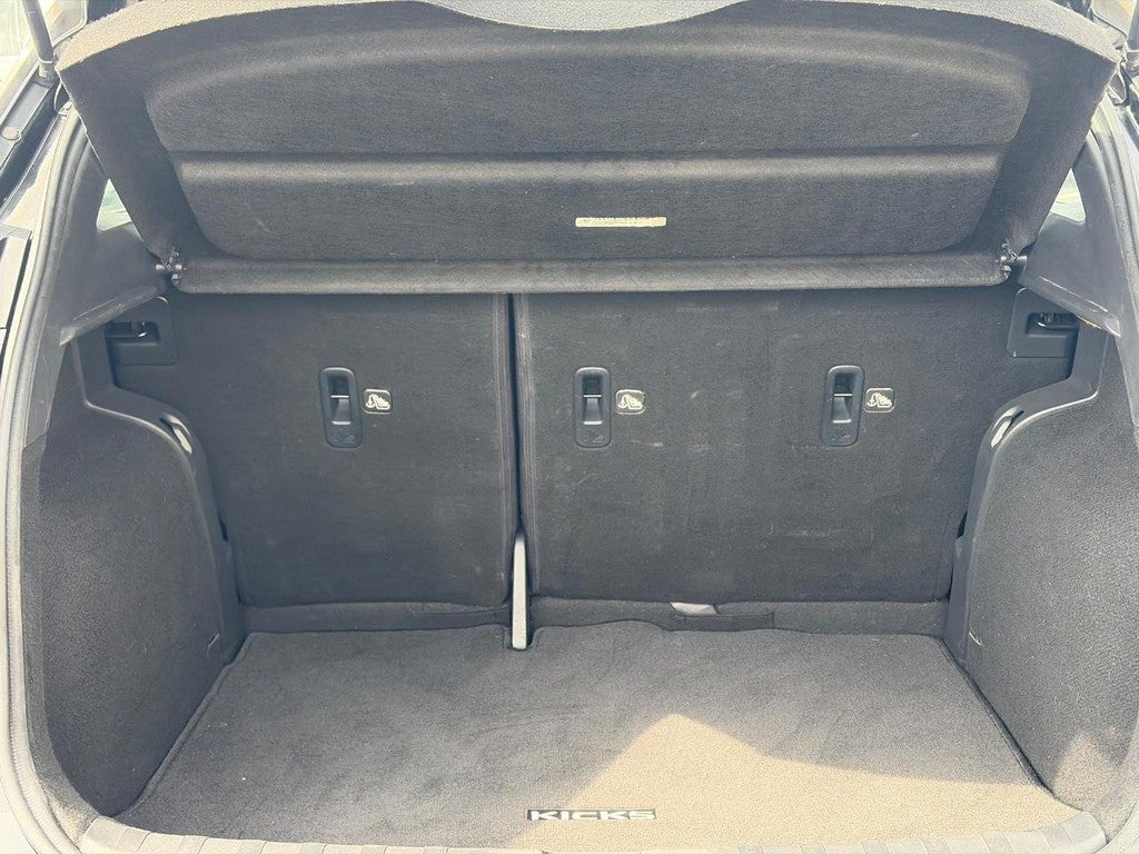 This Kicks is well equipped with 17" Alloy Wheels, 3.927 Axle Ratio, 6 Speakers, ABS brakes, Air Conditioning, Alloy wheels, AM/FM radio: SiriusXM, Apple CarPlay/Android Auto, Automatic temperature control, Blind Spot Warning, Brake assist, Bumpers: body-color, Carpeted Floor Mats w/Cargo Mat, Cloth Seat Trim, Compass, Driver door bin, Driver vanity mirror, Driver's Seat Mounted Armrest, Dual front impact airbags, Dual front side impact airbags, Electronic Stability Control, Front anti-roll bar, Front Bucket Seats, Front reading lights, Front wheel independent suspension, Fully automatic headlights, Heated door mirrors, Illuminated entry, Knee airbag, Low tire pressure warning, Occupant sensing airbag, Outside temperature display, Overhead airbag, Panic alarm, Passenger door bin, Passenger vanity mirror, Power door mirrors, Power steering, Power windows, Radio data system, Radio: AM/FM Audio System, Rear reading lights, Rear window defroster, Rear window wiper, Remote keyless entry, Roof rack: rails only, Speed control, Splash Guards (4 Piece), Split folding rear seat, Sport steering wheel, Steering wheel mounted audio controls, Tachometer, Telescoping steering wheel, Tilt steering wheel, Traction control, Trip computer, and Variably intermittent wipers.