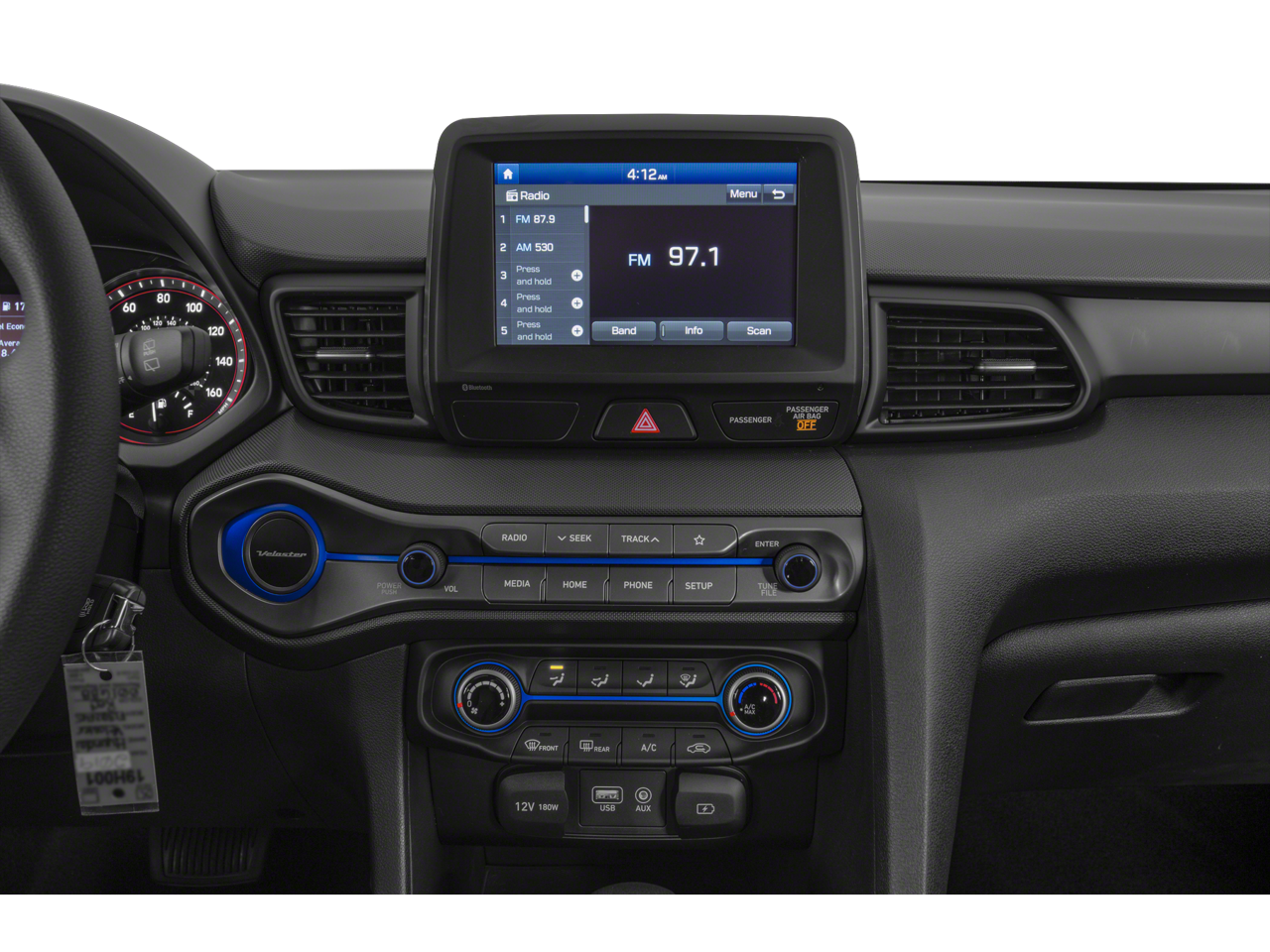 This Veloster is well equipped with Option Group 01, 17" x 7.0J Alloy Wheels, 4-Wheel Disc Brakes, 6 Speakers, ABS brakes, Air Conditioning, Alloy wheels, AM/FM radio, Apple CarPlay & Android Auto, Brake assist, Bumpers: body-color, Delay-off headlights, Driver door bin, Driver vanity mirror, Dual front impact airbags, Dual front side impact airbags, Electronic Stability Control, Exterior Parking Camera Rear, Four wheel independent suspension, Front anti-roll bar, Front Bucket Seats, Front Center Armrest, Front reading lights, Fully automatic headlights, Heated door mirrors, Illuminated entry, Low tire pressure warning, Occupant sensing airbag, Outside temperature display, Overhead airbag, Overhead console, Panic alarm, Passenger door bin, Passenger vanity mirror, Power door mirrors, Power steering, Power windows, Premium Cloth Seat Trim, Radio: AM/FM 7" Display Audio, Rear anti-roll bar, Rear window defroster, Rear window wiper, Remote keyless entry, Security system, Speed control, Speed-sensing steering, Split folding rear seat, Spoiler, Steering wheel mounted audio controls, Tachometer, Telescoping steering wheel, Tilt steering wheel, Traction control, Trip computer, and Variably intermittent wipers.