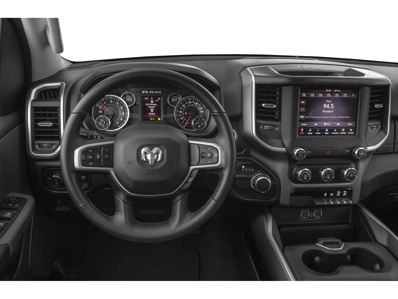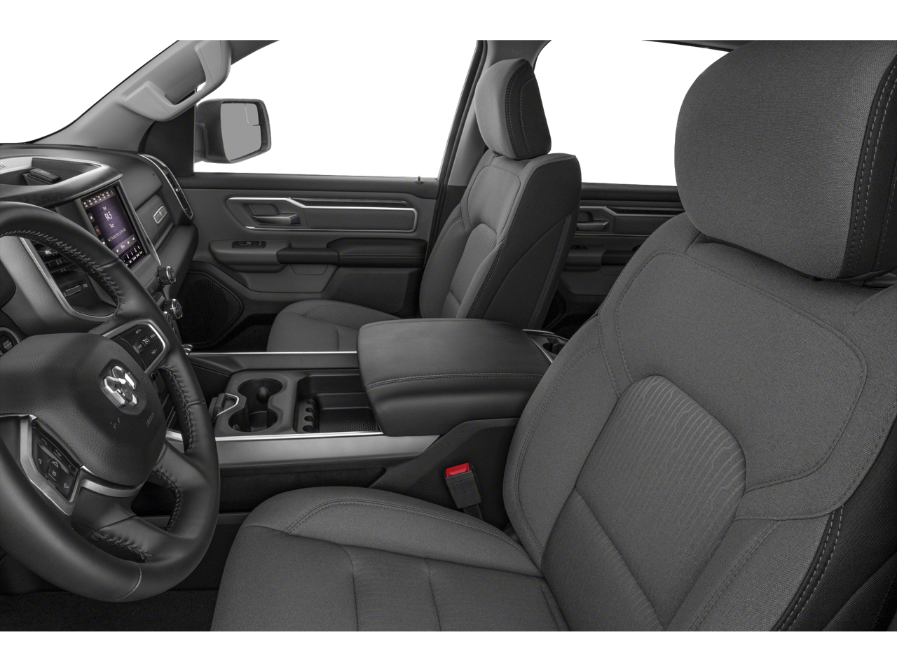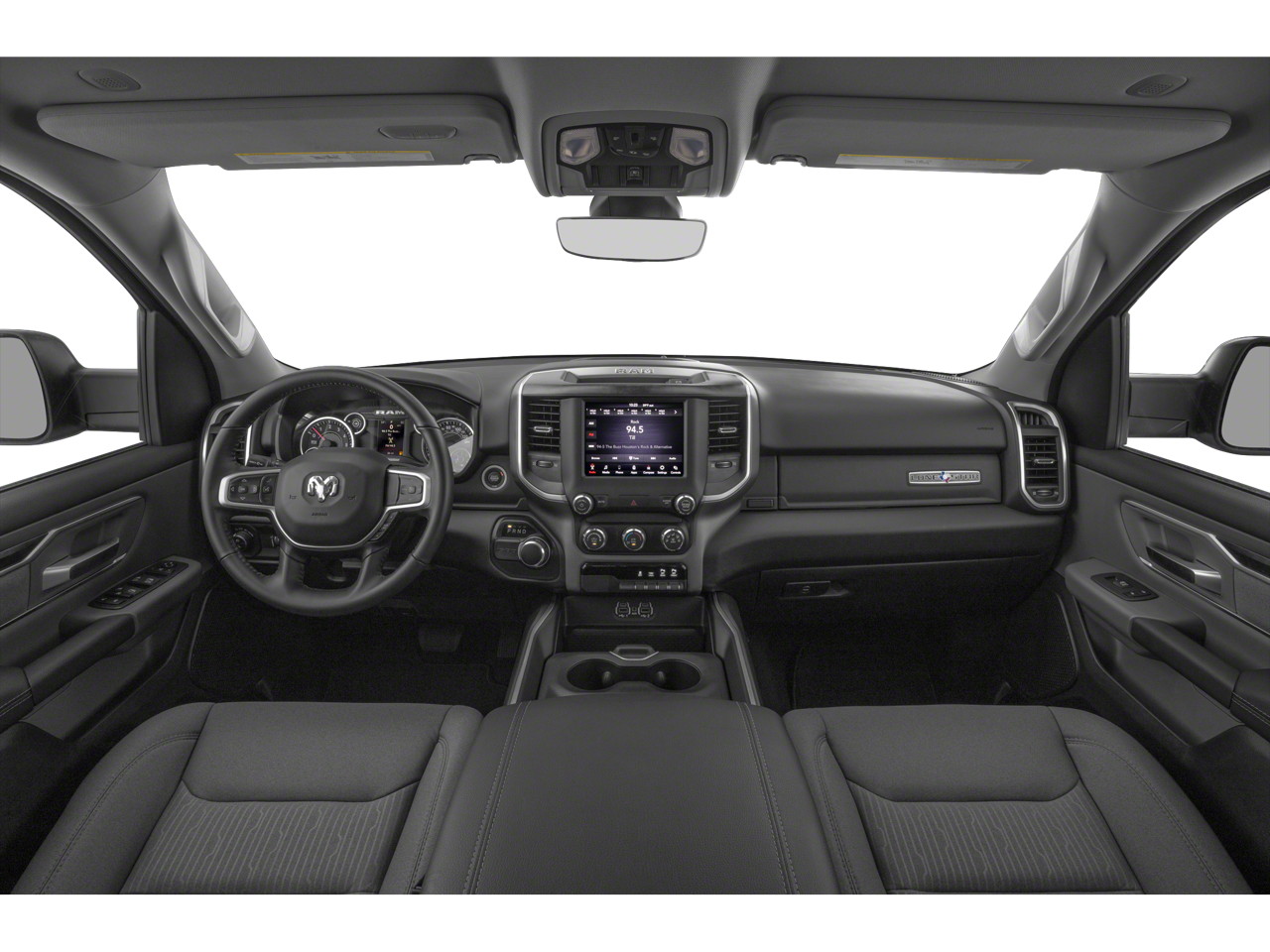This 1500 is well equipped with Bed Utility Group (4 Adjustable Cargo Tie-Down Hooks, Pick-Up Box Lighting, and Spray In Bedliner), Big Horn Level 2 Equipment Group (115V Auxiliary Power Outlet, 115V Auxiliary Rear Power Outlet, 2 USB Full Function/Charge Only Media Hub, 400W Inverter, 8.4" Touchscreen Display, Air Conditioning ATC w/Dual Zone Control, Auto-Dimming Rear-View Mirror, Big Horn IP Badge, Class IV Receiver Hitch, Cluster 7.0" TFT Color Display, Dampened Tailgate, Foam Bottle Insert (Door Trim Panel), Glove Box Lamp, Heated Front Seats, Heated Steering Wheel, Integrated Center Stack Radio, ParkSense Front/Rear Park Assist w/Stop, Power 4-Way Driver Lumbar Adjust, Power 8-Way Driver Seat, Power Adjustable Pedals, Power Heated Fold Away Mirrors, Radio: Uconnect 4 w/8.4" Display, Rear Dome w/On/Off Switch Lamp, Rear Power Sliding Window, Rear Window Defroster, Remote Start System, Security Alarm, Single Disc Remote CD Player, SiriusXM Satellite Radio, Sun Visors w/Illuminated Vanity Mirrors, and Universal Garage Door Opener), Black Appearance Package (3 Rear Seat Head Restraints, 4 Way Front Headrests, Auto-Dimming Exterior Driver Mirror, Black Exterior Truck Badging, Black Headlamp Bezels, Black Interior Accents, Body Color Door Handles, Body Color Front Bumper, Body Color Rear Bumper w/Step Pads, Bucket Seats, Center Console Parts Module, Deluxe Cloth Bucket Seats, Dual Exhaust w/Black Tips, Exterior Mirrors Courtesy Lamps, Exterior Mirrors w/Memory, Exterior Mirrors w/Supplemental Signals, Front Seat Back Map Pockets, Full Length Floor Console, Grille B/Color Outline 1 Texture 2, Manual Adjust 4-Way Front Passenger Seat, Power Heated Fold-Away Mirrors, Power-Folding Mirrors, Rear 60/40 Folding Seat, and Wheels: 20" x 9" Cast Aluminum Black), Premium Lighting Group (Front LED Fog Lamps, LED Reflector Headlamps, and LED Taillamps), Quick Order Package 23Z Big Horn/Lone Star (Steering Wheel Mounted Audio Controls), 3.21 Rear Axle Ratio, 4-Wheel Disc Brakes, 48V Belt Starter Generator, 6 Speakers, 9 Amplified Speakers w/Subwoofer, ABS brakes, Air Conditioning, Alloy wheels, AM/FM radio, Brake assist, Bumpers: chrome, Cloth Bench Seat, Compass, Delay-off headlights, Dome Dual LED Reading Lamp, Driver door bin, Dual front impact airbags, Dual front side impact airbags, Dual-Pane Panoramic Sunroof, Electronic Stability Control, Front & Rear Rubber Floor Mats, Front anti-roll bar, Front Center Armrest w/Storage, Front fog lights, Front reading lights, Front wheel independent suspension, Fully automatic headlights, GPS Antenna Input, Heated door mirrors, Illuminated entry, Leather steering wheel, Low tire pressure warning, Manufacturer's Statement of Origin, Occupant sensing airbag, Outside temperature display, Overhead airbag, Overhead console, Overhead LED Lamps, Panic alarm, ParkView Rear Back-Up Camera, Passenger door bin, Passenger vanity mirror, Power door mirrors, Power steering, Power windows, Premium Overhead Console, Radio data system, Radio: Uconnect 3 w/5" Display, Rear anti-roll bar, Rear seat center armrest, Rear step bumper, Rear Underseat Compartment Storage, Rear Wheelhouse Liners, Remote keyless entry, Speed control, Split folding rear seat, Tachometer, Telescoping steering wheel, Tilt steering wheel, Traction control, Tri-Fold Tonneau Cover, Trip computer, Variably intermittent wipers, Voltmeter, and Wheels: 18" x 8".
