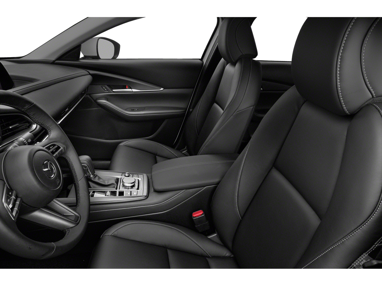 This Mazda CX-30 is well equipped with Select Package, 18" x 7J Alloy Wheels, 3.626 Axle Ratio, 4-Wheel Disc Brakes, 8 Speakers, ABS brakes, Air Conditioning, Alloy wheels, AM/FM radio, AppLink/Apple CarPlay and Android Auto, Auto High-beam Headlights, Automatic temperature control, Brake assist, Bumpers: body-color, Cargo Mat, Compass, Delay-off headlights, Driver door bin, Driver vanity mirror, Dual front impact airbags, Dual front side impact airbags, Electronic Stability Control, Emergency communication system: MAZDA CONNECT, Exterior Parking Camera Rear, Front anti-roll bar, Front Bucket Seats, Front Center Armrest, Front dual zone A/C, Front reading lights, Front wheel independent suspension, Fully automatic headlights, Illuminated entry, Knee airbag, Leather Shift Knob, Leather steering wheel, Leatherette Seat Trim, Low tire pressure warning, MAZDA CONNECT Infotainment System Voice Command, Occupant sensing airbag, Outside temperature display, Overhead airbag, Panic alarm, Passenger door bin, Passenger vanity mirror, Power door mirrors, Power steering, Power windows, Radio data system, Radio: AM/FM Audio System, Rain sensing wipers, Rear seat center armrest, Rear window defroster, Rear window wiper, Remote keyless entry, Speed control, Speed-sensing steering, Split folding rear seat, Spoiler, Steering wheel mounted audio controls, Tachometer, Telescoping steering wheel, Tilt steering wheel, Traction control, Trip computer, Turn signal indicator mirrors, and Variably intermittent wipers.