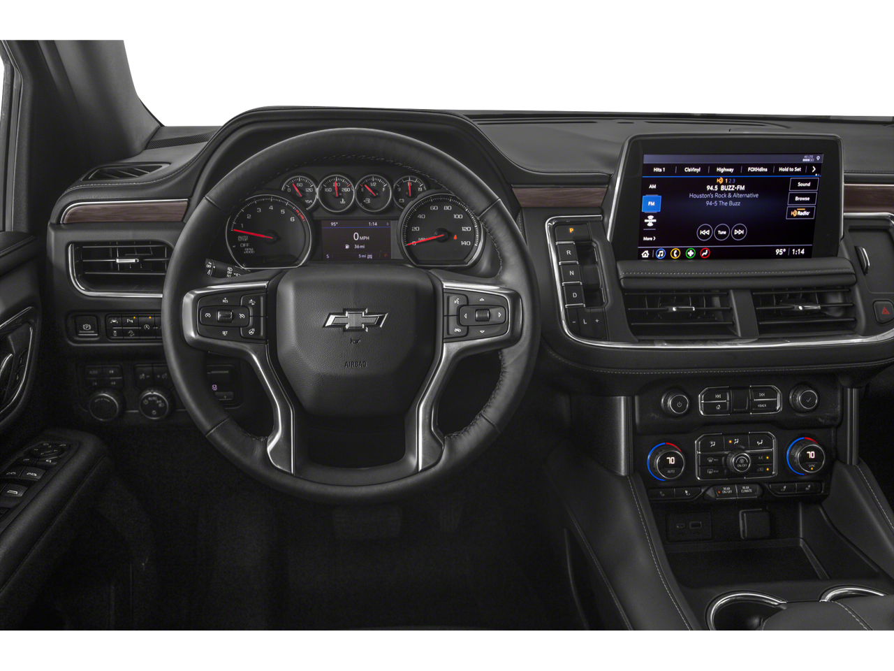 This Tahoe is well equipped with License Plate Front Mounting Package, Preferred Equipment Group 2Z7 (1st & 2nd Row Color-Keyed Carpeted Floor Mats, 2 USB Data Ports, 2-Speed Active Electronic AutoTrac Transfer Case, Auto-Dimming Inside Rear-View Mirror, Black Tubular Assist Steps, Bright Front & Rear Door Sill Plates, Color-Keyed Carpeting Floor Covering, Driver & Front Outboard Passenger Airbags, Floor Console w/Storage Area, Front High-Approach Angle Fascia, Hands-Free Rear Power Programmable Liftgate, HD Radio, Hill Descent Control, Infotainment Display, Leather-Wrapped Steering Wheel, LED Daytime Running Lamps, Memory Settings for Driver, Red Horizontal-Mounted Recovery Hooks, Remote Start, SiriusXM Radio w/360L, and Universal Home Remote), 4WD, Black Leather, 10-Way Power Driver & Passenger Seat Adjusters, 2nd Row Manual Bucket Seats, 3.23 Rear Axle Ratio, 3rd row seats: split-bench, 4-Wheel Disc Brakes, 9 Speakers, ABS brakes, Air Conditioning, Alloy wheels, AM/FM radio: SiriusXM with 360L, Apple CarPlay/Android Auto, Auto High-beam Headlights, Auto-dimming Rear-View mirror, Automatic temperature control, Bose 9-Speaker Stereo Audio System Feature, Brake assist, Bumpers: body-color, Compass, Delay-off headlights, Driver door bin, Driver vanity mirror, Dual front impact airbags, Dual front side impact airbags, Electronic Stability Control, Emergency communication system: OnStar and Chevrolet connected services capable, Four wheel independent suspension, Front anti-roll bar, Front Bucket Seats, Front Center Armrest, Front dual zone A/C, Front High-Back Reclining Bucket Seats, Front reading lights, Fully automatic headlights, Garage door transmitter, Heated door mirrors, Heated Driver & Front Passenger Seats, Heated front seats, Illuminated entry, Leather Seat Trim, Leather steering wheel, Low tire pressure warning, Memory seat, Occupant sensing airbag, Outside temperature display, Overhead airbag, Overhead console, Panic alarm, Passenger door bin, Passenger vanity mirror, Power door mirrors, Power driver seat, Power Liftgate, Power passenger seat, Power steering, Power windows, Premium audio system: Chevrolet Infotainment 3, Premium Smooth Ride Suspension, Radio: Chevrolet Infotainment 3 Plus System, Rain sensing wipers, Rear air conditioning, Rear anti-roll bar, Rear reading lights, Rear seat center armrest, Rear window defroster, Rear window wiper, Remote keyless entry, Roof rack: rails only, Security system, Speed control, Speed-sensing steering, Split folding rear seat, Spoiler, Steering wheel mounted audio controls, Tachometer, Telescoping steering wheel, Tilt steering wheel, Traction control, Trip computer, Variably intermittent wipers, Voltmeter, and Wheels: 20" x 9" Machined Aluminum.