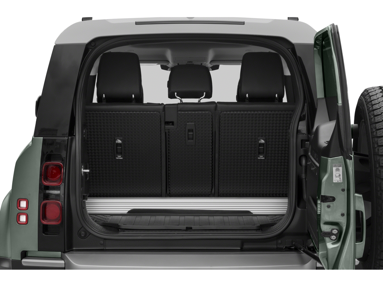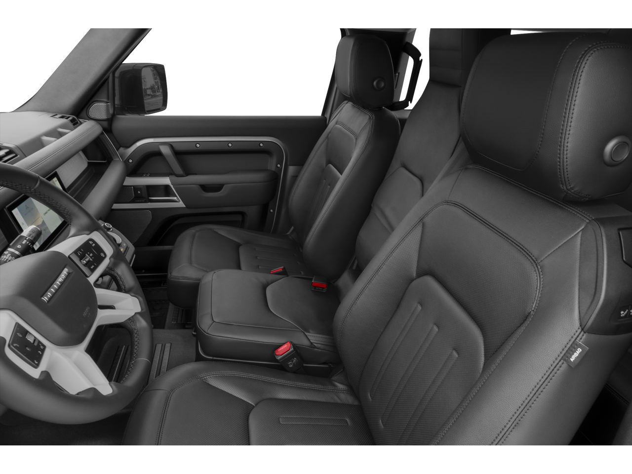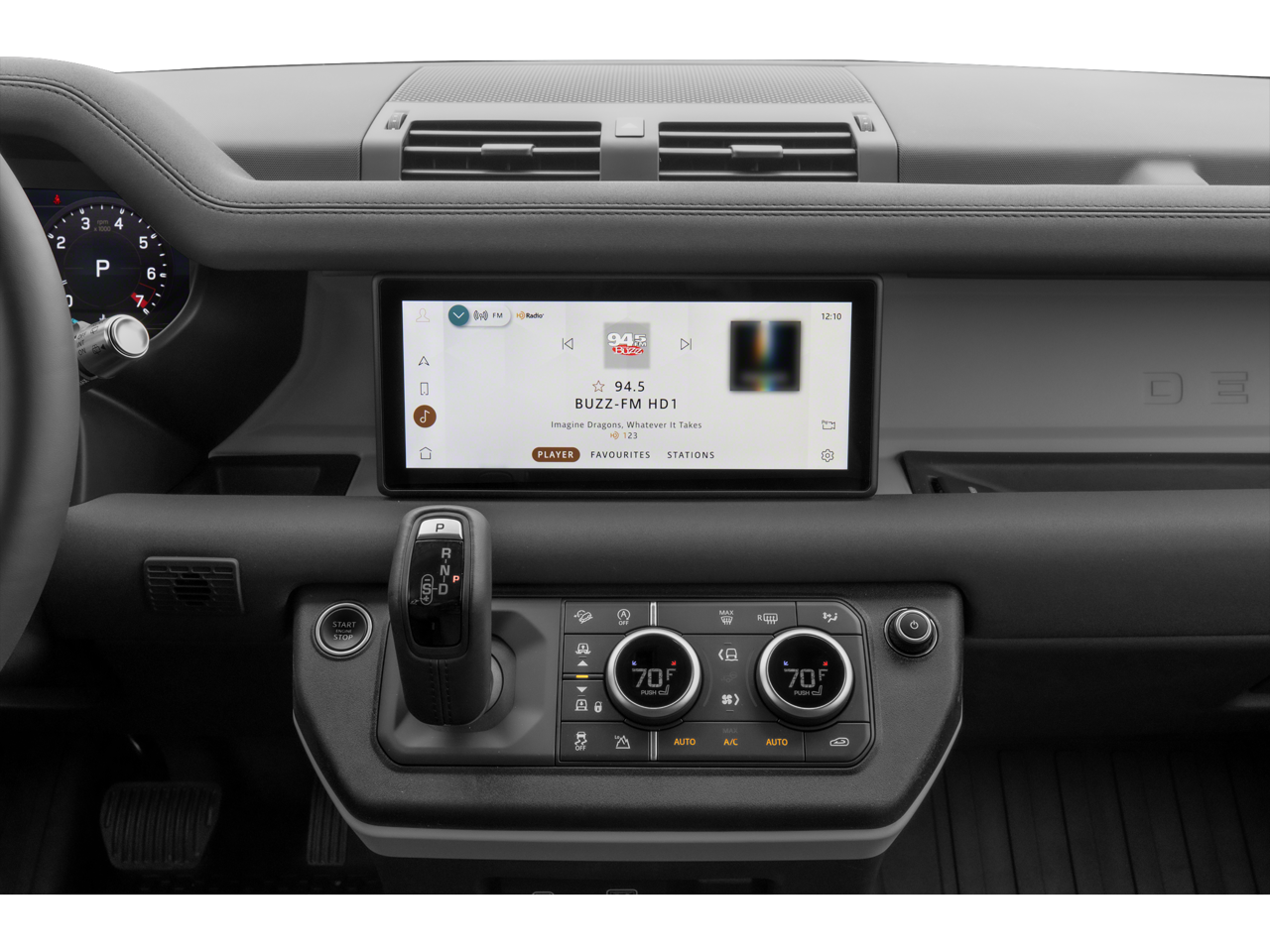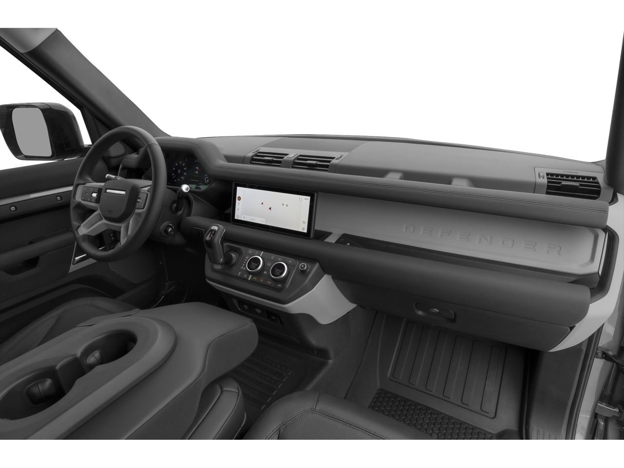 This Defender 90 is well equipped with 11 Speakers, 12-Way Semi-Powered Heated Seats, 3.55 Axle Ratio, 4-Wheel Disc Brakes, ABS brakes, Air Conditioning, Alloy wheels, AM/FM radio: SiriusXM, Apple CarPlay & Android Auto, Auto High-beam Headlights, Auto-dimming door mirrors, Auto-dimming Rear-View mirror, Automatic temperature control, Brake assist, Bumpers: body-color, Compass, Delay-off headlights, Driver door bin, Driver vanity mirror, Dual front impact airbags, Dual front side impact airbags, Electronic Stability Control, Four wheel independent suspension, Front anti-roll bar, Front Bucket Seats, Front Center Armrest, Front dual zone A/C, Front reading lights, Fully automatic headlights, Garage door transmitter: HomeLink, Grained Leather Seat Trim, Heated door mirrors, Heated front seats, Illuminated entry, Leather Shift Knob, Leather steering wheel, Low tire pressure warning, Navigation system: Connected Navigation PIVI Pro, Occupant sensing airbag, Outside temperature display, Overhead airbag, Overhead console, Panic alarm, Passenger door bin, Passenger vanity mirror, Power door mirrors, Power driver seat, Power passenger seat, Power steering, Power windows, Radio data system, Radio: 400W 11 Speaker Meridian Sound System, Rain sensing wipers, Rear anti-roll bar, Rear fog lights, Rear reading lights, Rear seat center armrest, Rear window defroster, Rear window wiper, Remote keyless entry, Roof rack: rails only, Security system, Speed control, Speed-sensing steering, Speed-Sensitive Wipers, Split folding rear seat, Steering wheel mounted audio controls, Tachometer, Telescoping steering wheel, Tilt steering wheel, Traction control, Trip computer, Variably intermittent wipers, Weather band radio, and Wheels: 19" Gloss Black Style 6010.