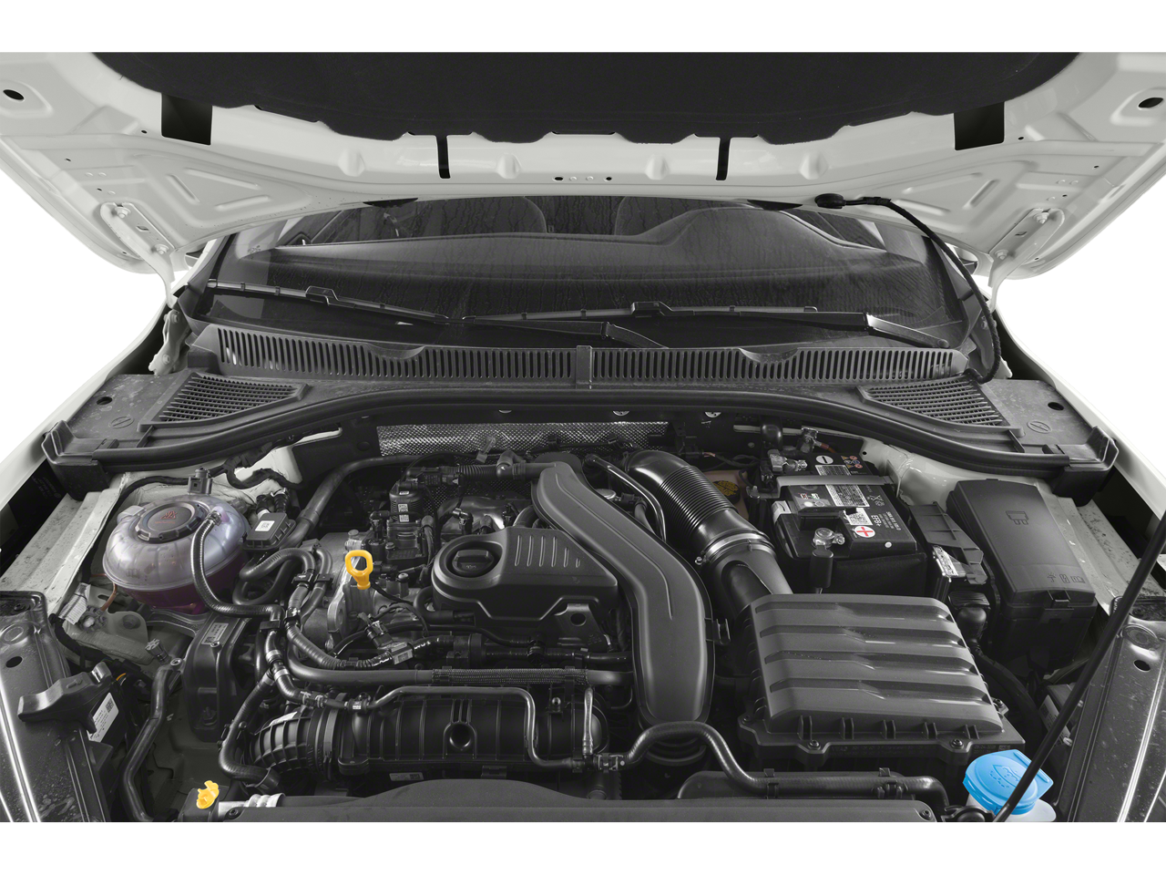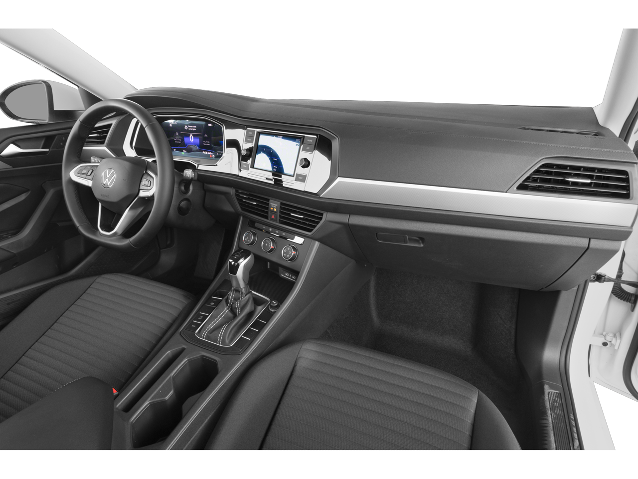 This Jetta is well equipped with Convenience Features (Auto-Dimming Interior Rear-View Mirror, Leather-Wrapped Steering Wheel & Shifter, and Rain-Sensing Automatic Front Wipers), Driver Assistance Package (WYD) (Adaptive Cruise Control (ACC) Stop & Go, Emergency Assist, Lane Assist (Lane Keeping System), and Travel Assist (Semi-Automated Driving Assistance)), Black Cloth, 4 Speakers, 4-Wheel Disc Brakes, ABS brakes, Air Conditioning, Alloy wheels, AM/FM radio, Brake assist, Bumpers: body-color, Cloth Seat Trim, Delay-off headlights, Driver door bin, Driver vanity mirror, Dual front impact airbags, Dual front side impact airbags, Electronic Stability Control, Emergency communication system: Car-Net, Exterior Parking Camera Rear, Front anti-roll bar, Front Bucket Seats, Front Center Armrest, Front wheel independent suspension, Fully automatic headlights, Heated door mirrors, Heavy Duty Trunk Liner w/VW CarGo Blocks, Illuminated entry, Low tire pressure warning, Monster Mats w/Logo Rubber Mats Kit (Set of 4), Occupant sensing airbag, Outside temperature display, Overhead airbag, Overhead console, Panic alarm, Passenger door bin, Passenger vanity mirror, Power door mirrors, Power steering, Power windows, Radio data system, Radio: MIB3 Composition Color w/6.5" Touchscreen, Rear anti-roll bar, Rear reading lights, Rear Sensors Delete, Rear window defroster, Remote keyless entry, Roadside Assistance Kit, Speed control, Speed-sensing steering, Split folding rear seat, Steering wheel mounted audio controls, Tachometer, Telescoping steering wheel, Tilt steering wheel, Traction control, Trip computer, Variably intermittent wipers, and Wheels: 16" 2-Tone Machined Alloy.