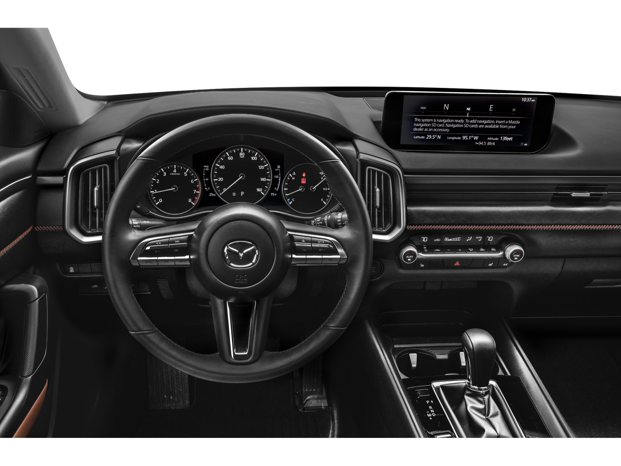 This Mazda CX-50 is well equipped with Cargo Package (Cargo Blocks), 3.841 Axle Ratio, 4-Wheel Disc Brakes, 8 Speakers, ABS brakes, Air Conditioning, Alloy wheels, AM/FM radio, AppLink/Apple CarPlay and Android Auto, Auto High-beam Headlights, Auto-dimming Rear-View mirror, Automatic temperature control, Brake assist, Bumpers: body-color, Compass, Delay-off headlights, Driver door bin, Driver vanity mirror, Dual front impact airbags, Dual front side impact airbags, Electronic Stability Control, Emergency communication system: MAZDA CONNECT, Exterior Parking Camera Rear, Front anti-roll bar, Front Bucket Seats, Front Center Armrest w/Storage, Front dual zone A/C, Front reading lights, Front wheel independent suspension, Fully automatic headlights, Garage door transmitter: HomeLink, Heated door mirrors, Heated Front Bucket Seats, Heated front seats, Illuminated entry, Knee airbag, Leather Seat Trim, Leather Shift Knob, Leather steering wheel, Low tire pressure warning, Memory seat, Occupant sensing airbag, Outside temperature display, Overhead airbag, Overhead console, Panic alarm, Passenger door bin, Passenger vanity mirror, Power door mirrors, Power driver seat, Power Liftgate, Power moonroof, Power passenger seat, Power steering, Power windows, Radio data system, Radio: AM/FM/HD Audio System, Rain sensing wipers, Rear seat center armrest, Rear window defroster, Rear window wiper, Remote keyless entry, Speed control, Speed-sensing steering, Split folding rear seat, Spoiler, Steering wheel mounted audio controls, Tachometer, Telescoping steering wheel, Tilt steering wheel, Traction control, Trip computer, Turn signal indicator mirrors, Variably intermittent wipers, Wheels: 18" x 8J Aluminum Alloy, and Zircon Sand Metallic Paint Charge.