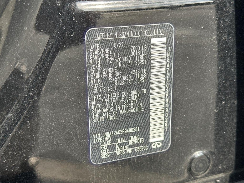 This QX80 is well equipped with Cargo Package (Cargo Net, Carpeted Cargo Mat, Center Console Tray, Console Net, and First-Aid Kit), Split Bench Seat Package, Navigation system: INFINITI InTouch Navigation, 13 Speakers, 2.937 Axle Ratio, 3rd row seats: split-bench, 4-Wheel Disc Brakes, ABS brakes, Air Conditioning, Alloy wheels, AM/FM radio: SiriusXM, Anti-whiplash front head restraints, Auto High-beam Headlights, Auto tilt-away steering wheel, Auto-dimming door mirrors, Auto-dimming Rear-View mirror, Auto-leveling suspension, Automatic temperature control, Brake assist, Bumpers: body-color, Compass, Delay-off headlights, Driver door bin, Driver vanity mirror, Dual front impact airbags, Dual front side impact airbags, Electronic Stability Control, Emergency communication system: INFINITI InTouch, Four wheel independent suspension, Front anti-roll bar, Front Bucket Seats, Front Center Armrest, Front dual zone A/C, Front fog lights, Front reading lights, Fully automatic headlights, Garage door transmitter: HomeLink, Heated door mirrors, Heated Front Bucket Seats, Heated front seats, Heated steering wheel, Illuminated entry, INFINITI Radiant Illuminated Kick Plates (N93), Leather Shift Knob, Leather steering wheel, Leather-Appointed Seats, Literature Kit, Low tire pressure warning, Memory seat, Occupant sensing airbag, Outside temperature display, Overhead airbag, Overhead console, Panic alarm, Passenger door bin, Passenger vanity mirror, Power door mirrors, Power driver seat, Power Liftgate, Power moonroof, Power passenger seat, Power steering, Power windows, Premium audio system: Bose, Radio data system, Radio: Bose Premium Audio System w/13 Speakers, Rain sensing wipers, Rear air conditioning, Rear anti-roll bar, Rear reading lights, Rear seat center armrest, Rear window defroster, Rear window wiper, Reclining 3rd row seat, Remote keyless entry, Security system, Speed control, Speed-sensing steering, Split folding rear seat, Spoiler, Steering wheel memory, Steering wheel mounted audio controls, Tachometer, Telescoping steering wheel, Tilt steering wheel, Traction control, Trip computer, Turn signal indicator mirrors, Variably intermittent wipers, Voltmeter, and Wheels: 20" x 8.0" Aluminum-Alloy.