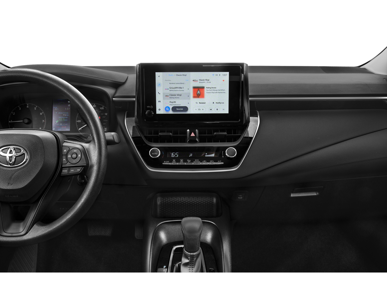 This Corolla is well equipped with 4-Wheel Disc Brakes, 6 Speakers, ABS brakes, Air Conditioning, AM/FM radio: SiriusXM, Auto High-beam Headlights, Automatic temperature control, Brake assist, Bumpers: body-color, Delay-off headlights, Driver door bin, Driver vanity mirror, Dual front impact airbags, Dual front side impact airbags, Electronic Stability Control, Emergency communication system: Safety Connect (up to 10-year trial subscription), Exterior Parking Camera Rear, Front anti-roll bar, Front Bucket Seats, Front Center Armrest, Front reading lights, Front wheel independent suspension, Fully automatic headlights, Illuminated entry, Knee airbag, Low tire pressure warning, Occupant sensing airbag, Outside temperature display, Overhead airbag, Panic alarm, Passenger door bin, Passenger vanity mirror, Power door mirrors, Power steering, Power windows, Premium Fabric Seat Trim, Radio data system, Radio: 8" Toyota Audio Multimedia, Rear anti-roll bar, Rear seat center armrest, Rear side impact airbag, Rear window defroster, Remote keyless entry, Speed control, Split folding rear seat, Steering wheel mounted audio controls, Tachometer, Telescoping steering wheel, Tilt steering wheel, Traction control, Trip computer, Variably intermittent wipers, and Wheels: 16" Wide Vent Steel.