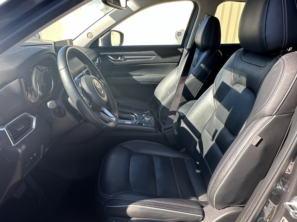 This Mazda CX-5 is well equipped with Mazda Certified Pre-Owned Certified, 4-Wheel Disc Brakes, 6 Speakers, ABS brakes, Air Conditioning, Alloy wheels, AM/FM radio, AppLink/Apple CarPlay and Android Auto, Auto High-beam Headlights, Auto-dimming Rear-View mirror, Automatic temperature control, Brake assist, Bumpers: body-color, Delay-off headlights, Driver door bin, Driver vanity mirror, Dual front impact airbags, Dual front side impact airbags, E911 Automatic Emergency Notification, Electronic Stability Control, Emergency communication system: MAZDA CONNECT, Exterior Parking Camera Rear, Four wheel independent suspension, Front anti-roll bar, Front Bucket Seats, Front Center Armrest w/Storage, Front dual zone A/C, Front reading lights, Fully automatic headlights, Garage door transmitter: HomeLink, Heated Front Bucket Seats, Heated front seats, Illuminated entry, Infotainment System Voice Command, Leather Seat Trim, Leather Shift Knob, Leather steering wheel, Low tire pressure warning, Machine Gray Metallic Paint, Memory seat, Multifunction Commander Control, Occupant sensing airbag, Outside temperature display, Overhead airbag, Overhead console, Pandora, Panic alarm, Passenger door bin, Passenger vanity mirror, Power door mirrors, Power driver seat, Power Liftgate, Power moonroof, Power passenger seat, Power steering, Power windows, Radio Broadcast Data System Program Information, Radio data system, Radio: AM/FM/HD Audio System, Rain sensing wipers, Rear anti-roll bar, Rear reading lights, Rear seat center armrest, Rear window defroster, Rear window wiper, Remote keyless entry, SMS Text Msg Audio Delivery & Reply, Speed control, Speed-sensing steering, Split folding rear seat, Spoiler, Steering wheel mounted audio controls, Tachometer, Telescoping steering wheel, Tilt steering wheel, Traction control, Trip computer, Turn signal indicator mirrors, Variably intermittent wipers, and Wheels: 17" x 7J Aluminum Alloy.